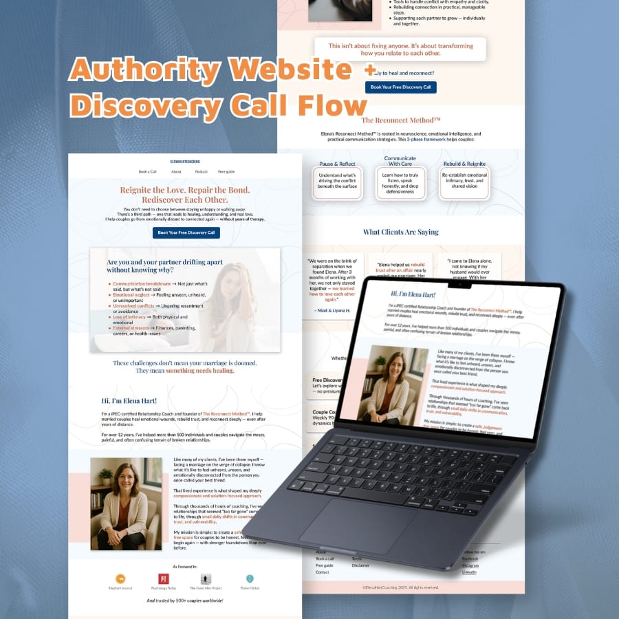 A credibility-focused site built to highlight expertise, credentials, and guide qualified couples toward booking a discovery call.